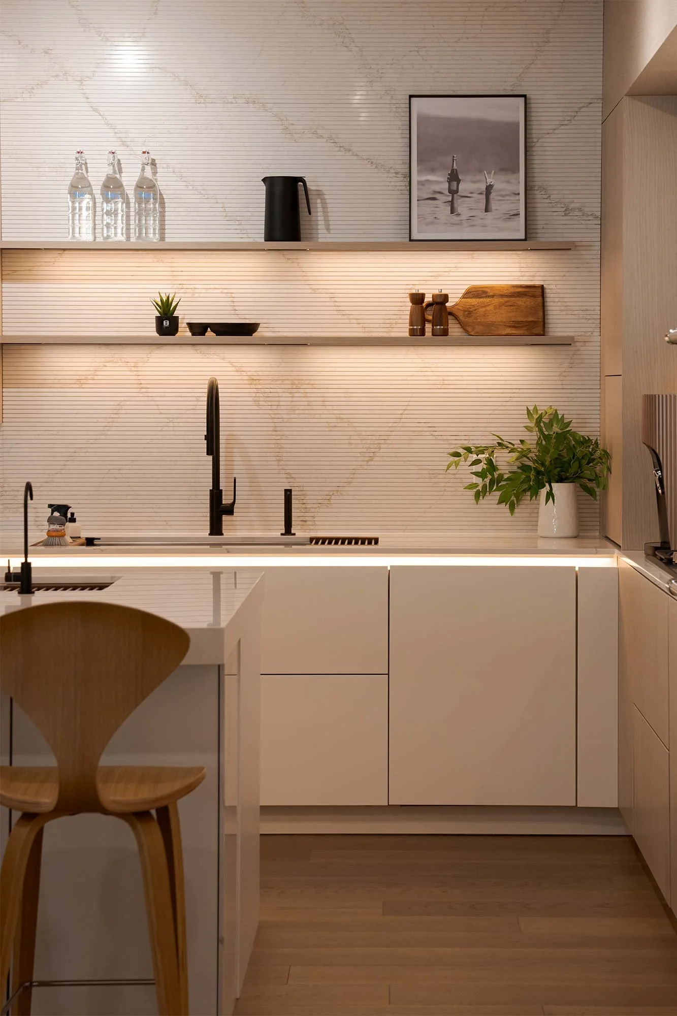 • A handle-less system with an illuminated handle trim profile for a sleek, graphic look.