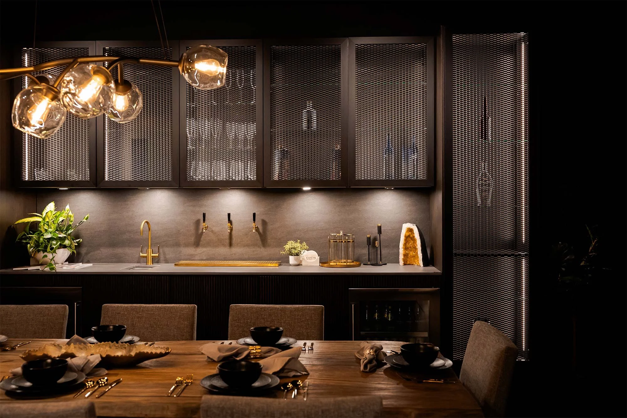 • An elegant drawer system with narrow anthracite metal frames, internal LED lighting, and glass fronts, enhancing both aesthetics and function.
